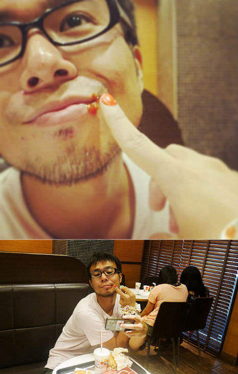 Keishke faz isso em público, tranquilamente e ninguém parece ligar. Um épico Forever Alone. Agora diz: se ele postasse somente essa foto no Facebook, você duvidaria que ele está com uma mulher? É perfeito! Ele passa base na mão e usa uma manga diferente para parecer que é outra pessoa. O resultado são essas fotos hilárias abaixo. Primeiro, o processo de efeitos especiais da mão e depois as montagens.