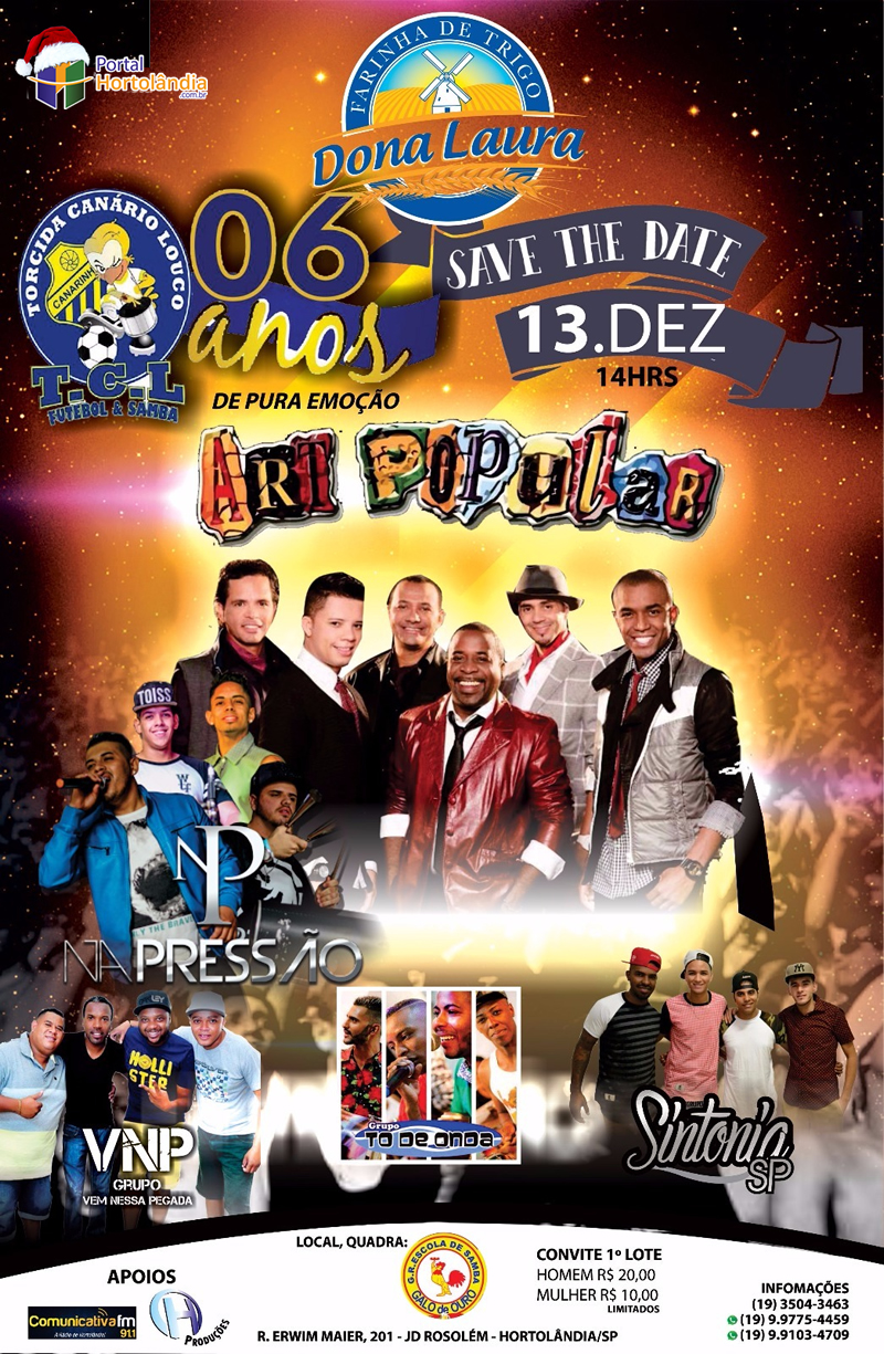 Domingo, 13 de dezembro de 2015, o Art Popular vai se apresentar no Aniversario da Torcida Canario Louco – 6 anos de pura emoção, na sede da Escola de Samba Galo de Ouro, em Hortolândia.