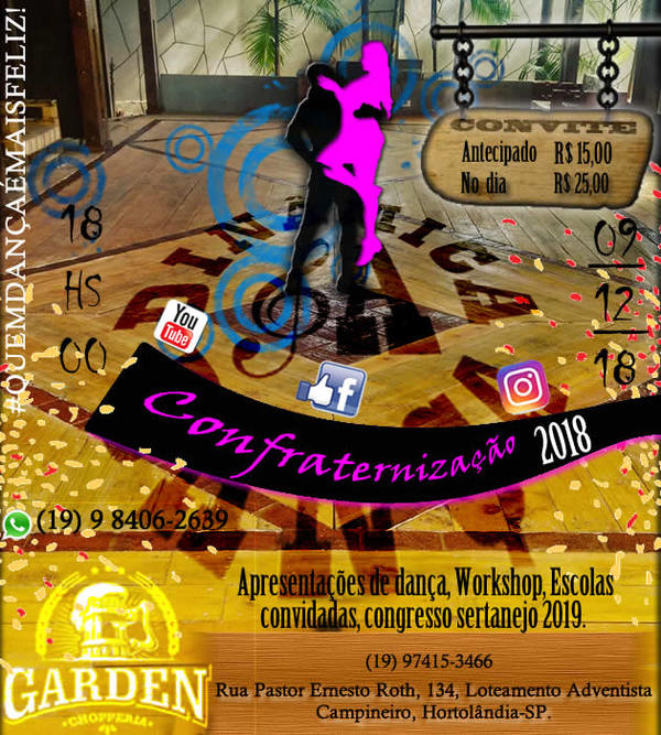 Acontece no dia 9 de dezembro a tradicional confraternização da escola “Dinâmica da Dança”, e este ano será num espaço diferenciado, na Garden Chopperia, a melhor casa de Hortolândia, espaço inovador e refinado.