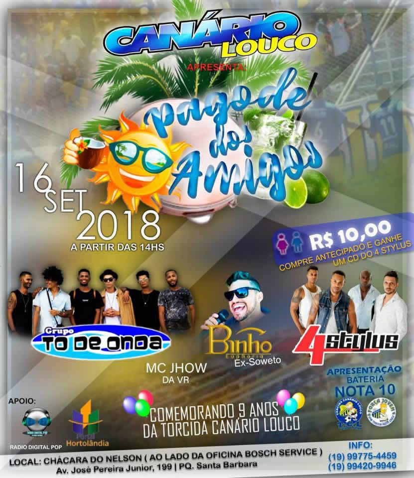 Domingo, 16 de setembro de 2018, grandes atrações do pagode iram se apresentar no Aniversario da Torcida Canário Louco – 9 anos de pura emoção, na Chácara do Nelson (Ao lado da oficina Bosch Service).