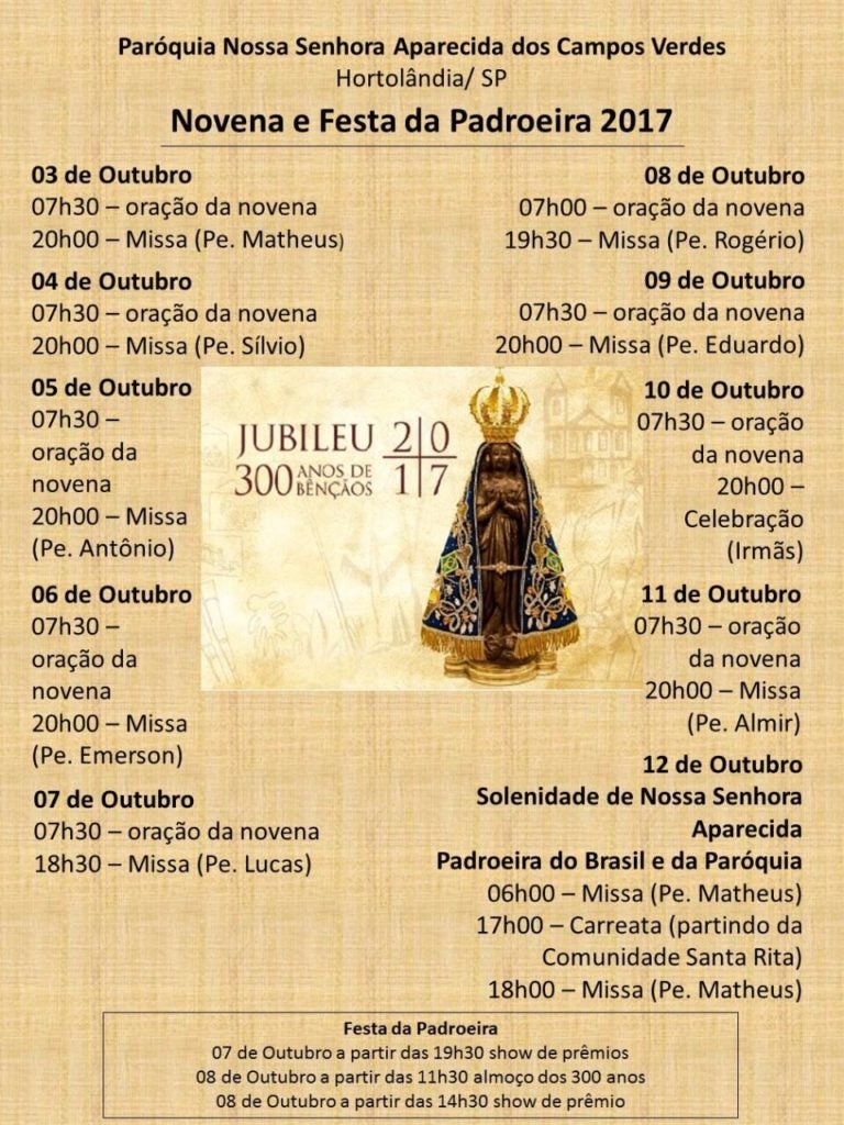A Paróquia Nossa Senhora Aparecida dos Campos Verdes tem a alegria de convidar você e sua família para a Festa da Padroeira, que acontecerá nos próximos 07 e 08 de outubro. Sábado, 07/10, a partir das 19h30 e domingo, 08/10, a partir das 14h00.
