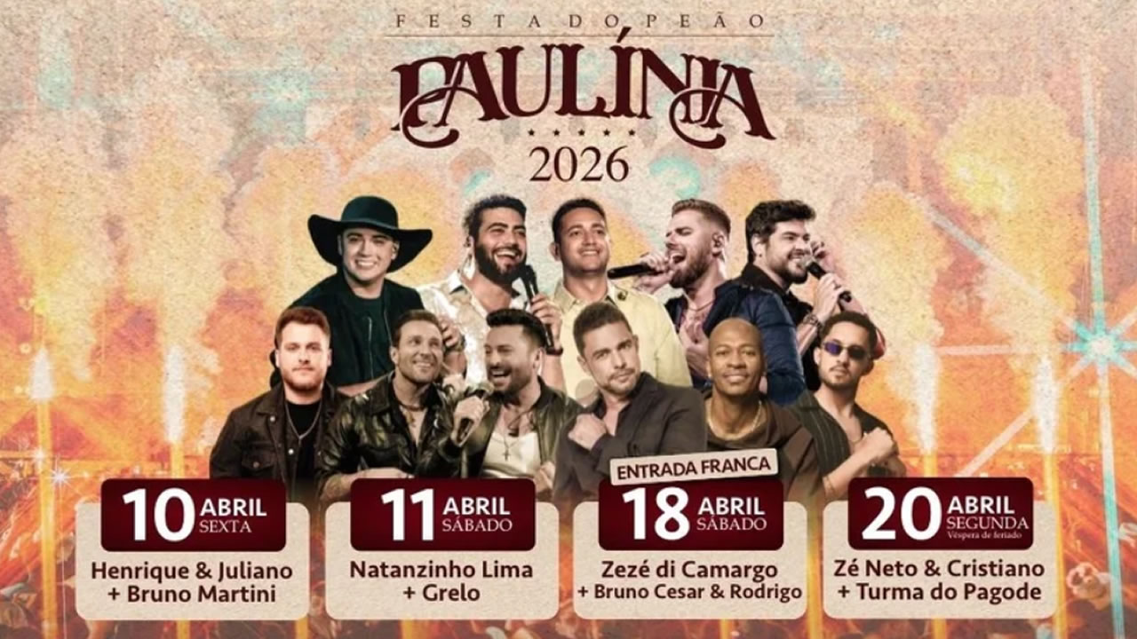A grade de atrações da Festa do Peão de Paulínia 2026 reúne nomes conhecidos da música sertaneja e do pagode, com apresentações distribuídas ao longo do período do evento.