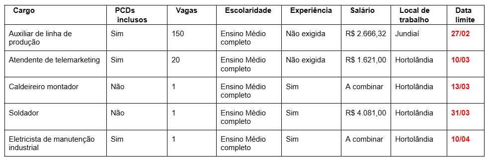 Confira todas as vagas de emprego anunciadas no PAT Hortolândia, sendo 150 para auxiliar de linha de produção