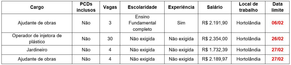 Hoje (28), o PAT Hortolândia anuncia 41 vagas de emprego. Portanto, caso tenha as características e requisitos necessários para as funções, inscreva-se e boa sorte.