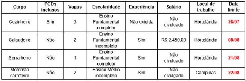 Hoje (23), o PAT Hortolândia anuncia 8 vagas de emprego. Portanto, caso tenha as características e requisitos necessários para as funções, inscreva-se e boa sorte. Lembrando que o PAT funciona das 8h às 16h30, de segunda a sexta-feira e está localizada na Rua Argolino de Moraes, 405, na Vila São Francisco.