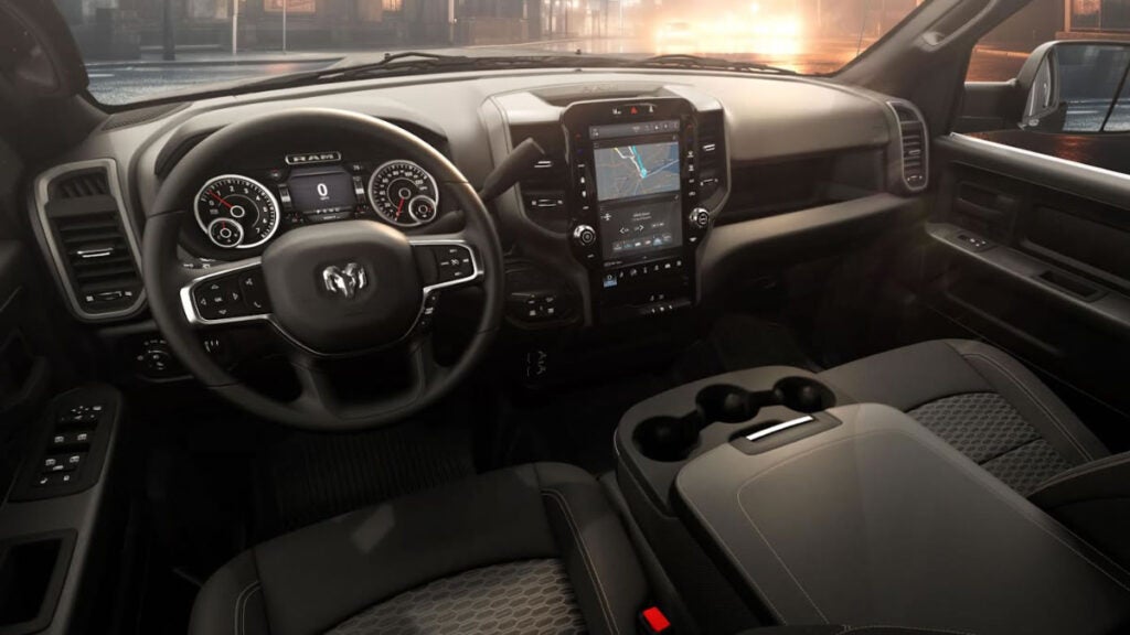 A Ram 2500 Warlock vem equipada com pneus Goodyear Duratrac A/T de 34 polegadas, amortecedores Bilstein para terrenos mistos, assistente de descida e proteção da caixa de transferência. Ambas as versões oferecem bancos em tecido, acabamento interno com carpete e sensores de estacionamento dianteiro e traseiro.