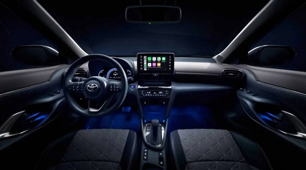O interior do Toyota Yaris Cross é repleto de tecnologias, incluindo um painel digital configurável, volante multifuncional, carregamento de celulares por indução, climatização digital, teto solar panorâmico e sistema de som Premium da JBL, proporcionando conforto e conveniência aos ocupantes.