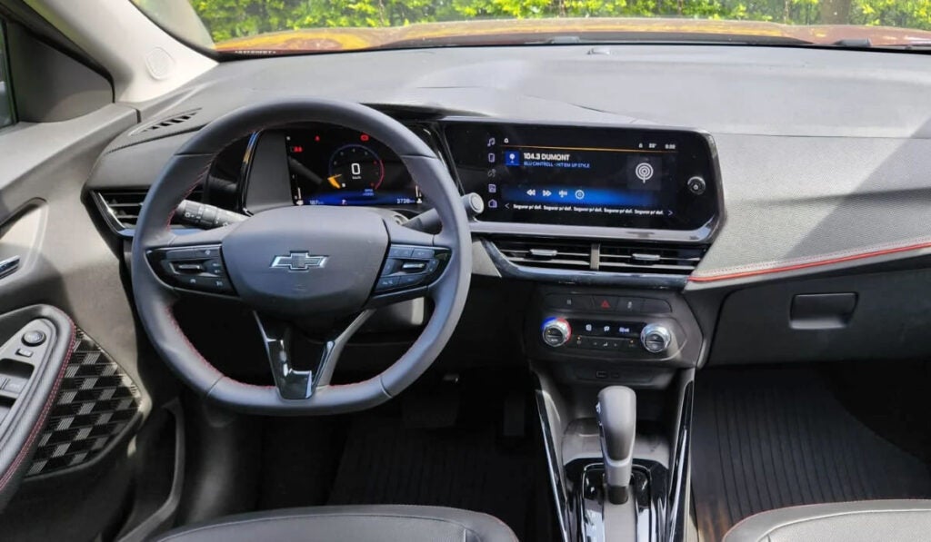 O interior da versão RS Turbo é um dos grandes diferenciais da linha. O painel digital de 8 polegadas e a central multimídia MyLink de 11 polegadas formam o chamado cockpit virtual da Chevrolet, com interface intuitiva e rápida. A câmera de ré digital de alta resolução facilita manobras no uso urbano, enquanto bancos, volante e comandos apresentam boa ergonomia para o dia a dia.