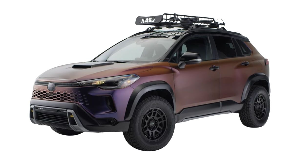 A Toyota revelou no SEMA Show 2025, em Las Vegas (EUA), o Corolla Cross Nasu Edition, um conceito híbrido com design voltado para aventuras leves e trilhas fora de estrada. O modelo traz pintura camaleão inspirada no Monte Nasu, tração integral e pneus off-road, destacando o apelo visual robusto e tecnológico da marca japonesa.