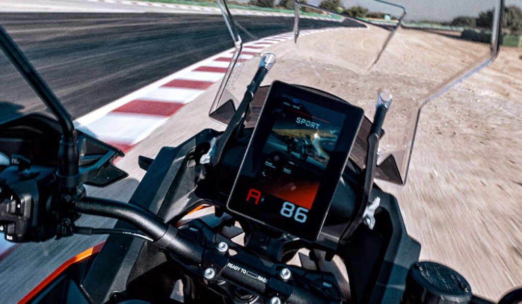 Outro destaque é o novo painel TFT vertical de 8 polegadas, que funciona como o cérebro da motocicleta. A tela sensível ao toque opera mesmo com luvas grossas e concentra todas as funções: mapas de motor, controle de tração sensível ao ângulo de inclinação, modos de pilotagem e navegação integrada passo a passo.