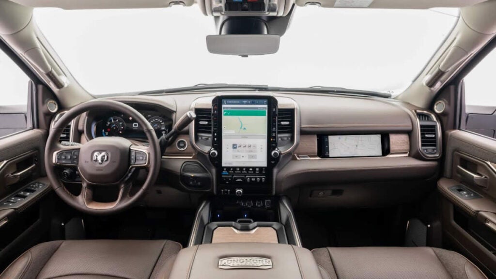 Pensada para quem precisa de força no trabalho, a Ram 3500 2025 inclui câmera para monitoramento da caçamba, câmera Mopar para reboque, assistente de manobras em ré autônomo e retrovisores expansíveis eletricamente.