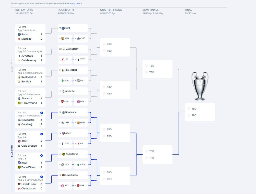 Real Madrid, Atalanta, PSG, Galaratasay Newcastle, Atlético de Madrid, Bodo/Glimt e Bayer Leverkusen, que passaram pelo playoff, se juntam a Arsenal, Bayern, Liverpool, Tottenham, Barcelona, Chelsea, Sporting e Manchester City que se classificaram no G8.