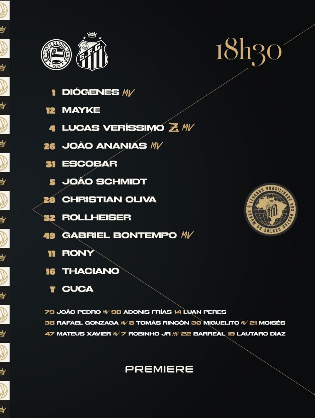 No banco de reservas, o Peixe tem: João Pedro, Adonis, Luan Peres, Rafael Gonzaga, Tomas Rincón, Miguelito, Moisés, Mateus Xabier, Robinho, Barreal e Lautaro.