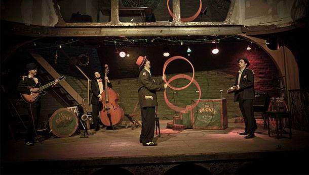 O espetáculo circense musical traz a essência dos espetáculos de rua e cabarés dos anos 30, onde a figura do showman representava a interdisciplinariedade dos artistas daquela época. As improvisações humorísticas permeiam a dramaturgia, trazendo um frescor ao espetáculo elaborado com técnicas antigas de malabares.