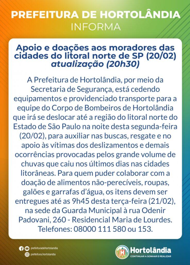 A Prefeitura de Hortolândia, por meio da Secretaria de Segurança, está cedendo equipamentos e providenciado transporte para a equipe do Corpo de Bombeiros de Hortolândia que irá se deslocar até a região do litoral norte do Estado de São Paulo na noite desta segunda-feira (20/02), para auxiliar nas buscas, resgate e no apoio às vítimas dos deslizamentos e demais ocorrências provocadas pelos grande volume de chuvas que caiu nos últimos dias nas cidades litorâneas. Para quem puder colaborar com a doação de alimentos não-perecíveis, roupas, galões e garrafas d’água, os itens devem ser entregues até as 9h45 desta terça-feira (21/02), na sede da Guarda Municipal à rua Odenir Padovani, 260 – Residencial Maria de Lourdes.