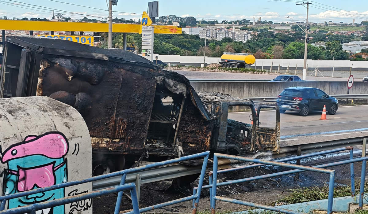 Um caminhão ficou completamente destruído após pegar fogo na tarde desta quarta feira 31, no quilometro 7 da Rodovia Jornalista Francisco Aguirre Proença, em Hortolândia. Apesar da gravidade do incidente, não houve registro de feridos.