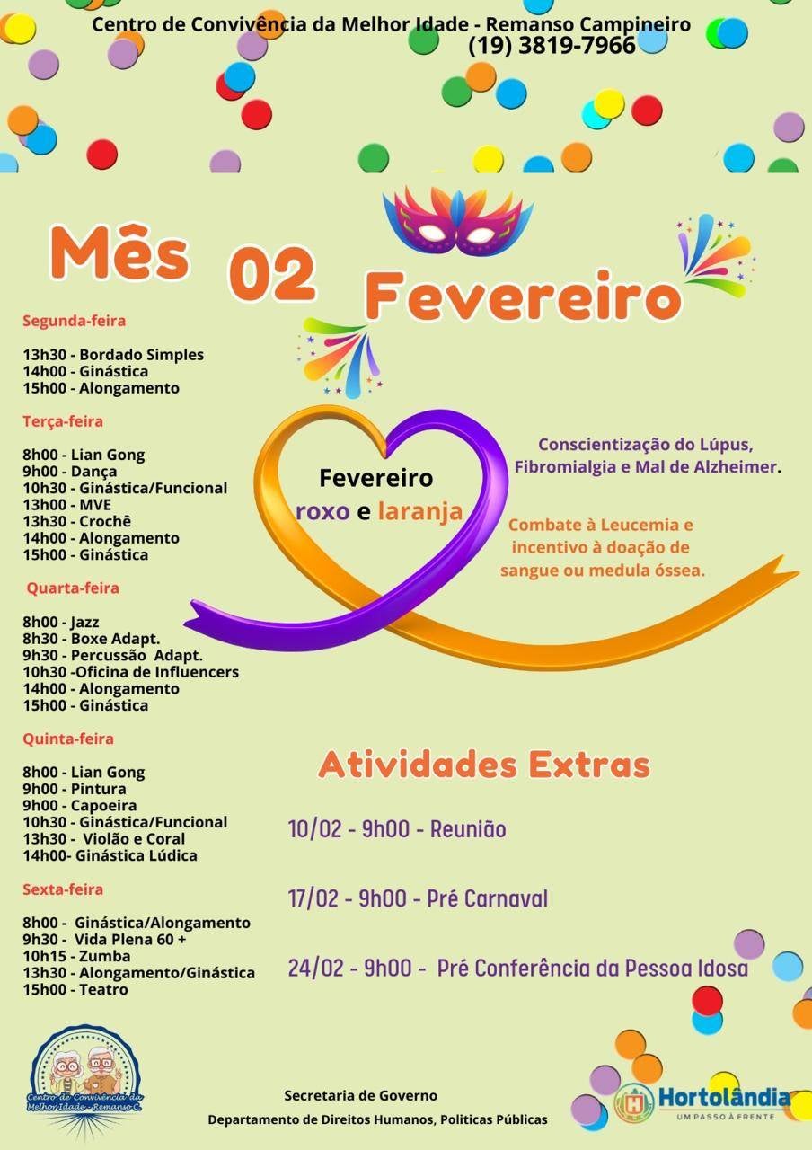 O Centro de Convivência da Melhor Idade – CCMI do Remanso Campineiro, espaço administrado pela Prefeitura de Hortolândia, terá um mês de fevereiro repleto de atividades para os idosos. Às segundas-feiras, serão oferecidas aulas de bordado simples, ginástica e alongamento.