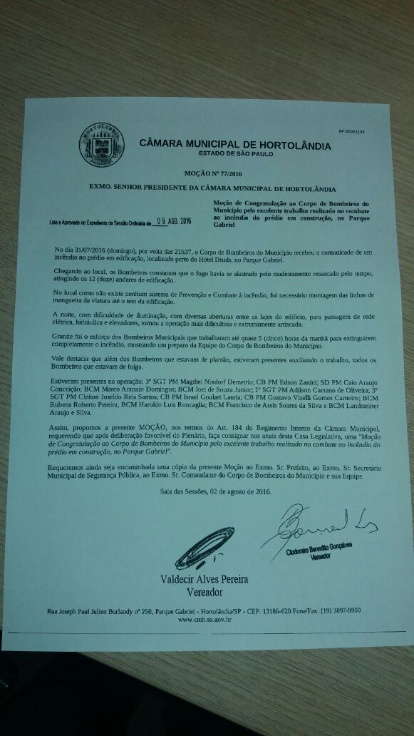 A Câmara Municipal de Hortolândia, através do presidente da casa, emite moção de agradecimento elogiando e parabenizando os Bombeiros de Hortolândia pelo ato corajoso desempenhado no município dia 31 de julho 16, quando um incêndio de grandes proporções quase consumiu um edifício em construção localizado no bairro Parque Gabriel, próximo ao Hotel Drud’s.
