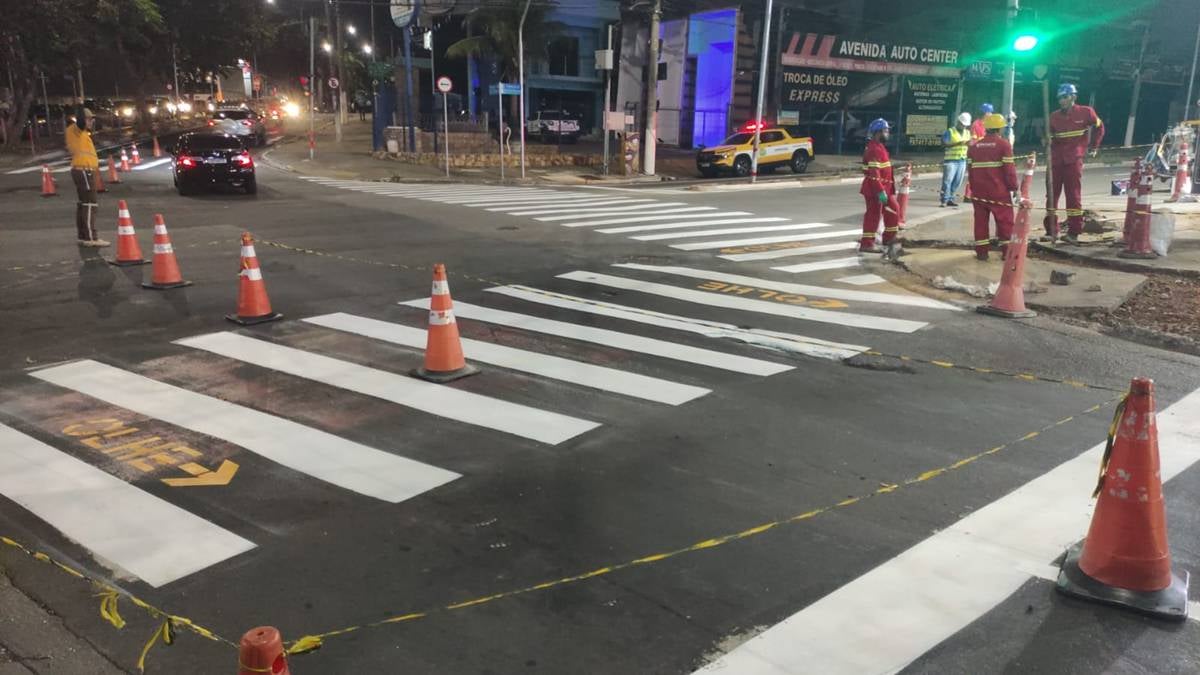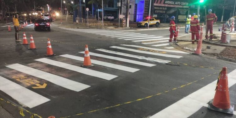 A região, que possui alto fluxo de circulação e diversos comércios, recebeu a pintura de faixas de pedestres, faixas brancas de retenção e linhas seccionadas brancas, priorizando a segurança de quem trafega pelo local.