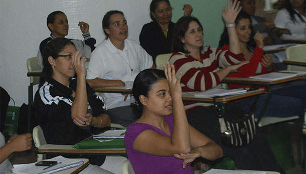 “A Secretaria promove cursos de formação continuada em Libras com o objetivo de fortalecer as Políticas Públicas de Educação Inclusiva no município, visando atender tanto os alunos deficientes, matriculados na rede, quanto as solicitações da comunidade”, afirma a secretária de Educação Cleudice baldo Meira.