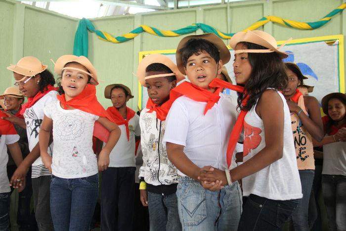 Em seguida, trajadas com lenços vermelhos e chapéus de couro, à moda “Lampião e Maria Bonita”, as crianças dançaram e cantaram forrós e baiões consagrados na voz do Rei do Baião, Luiz Gonzaga. No pout pourri, canções muito conhecidas como “Asa Branca”, “A Volta da Asa Branca”, “Paraíba” e “Forró no Escuro” (O candeeiro se apagou…). Segundo a professora de música, Cássia Fernandes Cuelbas, a seleção foi feita com base em levantamento feito na região, que revelou que os dois gêneros musicais mais ouvidos em casa são forró e funk. Os ritmos têm sido trabalhados desde então. No caso do baião, os estudos começaram antes mesmo das festas juninas para que os alunos estivessem preparados para se apresentar nos eventos típicos.