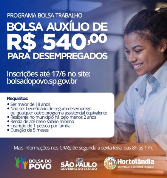 A Pandemia do Coronavírus deixou muitas pessoas sem trabalho e em situação de vulnerabilidade social. Para proporcionar ocupação a esse público e impulsionar a retomada econômica no pôs-pandemia, o governo do Estado, com apoio da Prefeitura de Hortolândia, implementa o programa “Bolsa Trabalho”. A iniciativa oferecerá uma bolsa auxílio no valor de R$ 540,00 para desempregados. Para participar do programa, e necessário fazer inscrição no site Bolsa do Povo. O prazo de inscrição começou no dia 31 de maio e vai até 17 de junho pelo site (www.bolsadopovo.sp.gov.br). O programa também oferecerá vagas de emprego temporárias em órgãos públicos do município, com jornada de trabalho de quatro horas diárias, de segunda a sexta-feira. De acordo com a Secretaria de Inclusão e Desenvolvimento Econômico, o município oferecerá 150 vagas de emprego em Secretarias Municipais e órgãos públicos da cidade.