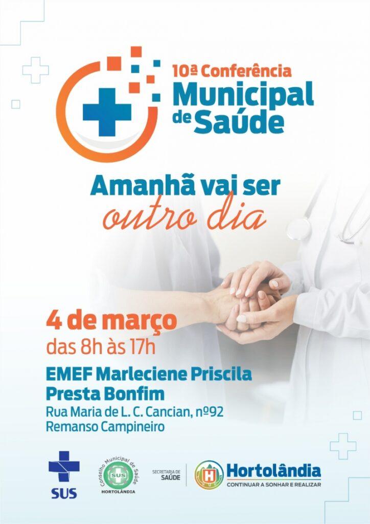 “Garantir direitos e defender o SUS (Sistema Único de Saúde), a vida e a democracia – Amanhã vai ser outro dia”. Este é o tema da 10ª Conferência Municipal de Saúde que a Prefeitura de Hortolândia promove no dia quatro de março deste ano, das 8h às 17h, na Emef (Escola Municipal de Ensino Fundamental) Marleciene Priscila Presta Bonfim, localizada na Rua Maria de Lourdes C. Cancian, 92, no Remanso Campineiro.