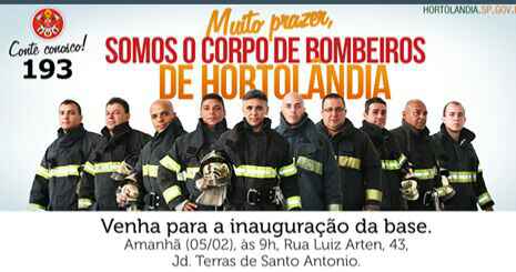 O prefeito Antonio Meira, em parceria com a Corporação de Bombeiros de Campinas, inaugura, nesta quinta-feira (05/02), às 9h, a primeira unidade do Corpo de Bombeiros de Hortolândia. A cerimônia acontece na sede da unidade, na rua Luís Arten, 43, no Jardim Terras de Santo Antonio. O endereço é interligado à Rodovia Jornalista Francisco Aguirre de Proença-SP 101, na entrada da cidade. O governador Geraldo Alckmin e outras autoridades participarão da cerimônia. A inauguração é uma conquista da população que reivindica o serviço há mais de uma década.