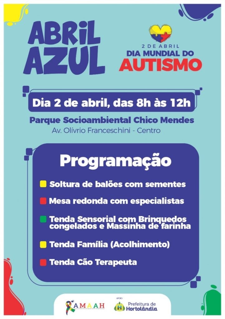 AMAAH Abril Azul começa a partir das 8h no Parque Chico Mendes e haverá diversas atrações e soltura de balões com sementes de árvoresNo próximo sábado (02/04), Dia Mundial do Autismo, a AMAAH (Associação de Mães e Amigos dos Autistas de Hortolândia), com apoio da Prefeitura de Hortolândia, promoverá uma manhã de integração e conscientização junto às famílias de autistas e comunidade sobre o TEA (Transtorno do Epectro Autista). A atividade denominada “AMAAH Abril Azul”, acontece a partir das 8 horas no Parque Socioambiental Chico Mendes, localizado na Avenida Olívio Franceschini, s/nº, Centro.