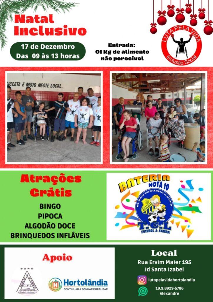 Evento conta com apoio da Prefeitura de Hortolândia e acontecerá a partir das 9 horas na sede do Clube de Veteranos IndependentesO projeto de Inclusão Social para Pessoas com Deficiência “Luta pela Vida” realizará no próximo sábado, 17 de dezembro, o evento Natal Inclusivo. A atividade acontece das 9h às 13h na sede do Clube de Veteranos Independentes (C.V.I), localizado na rua Ervim Maier, 195, no Jd. Santa Izabel. Para participar, a entrada será um quilo de alimento não perecível que será destinado ao Fundo Social de Solidariedade de Hortolândia.