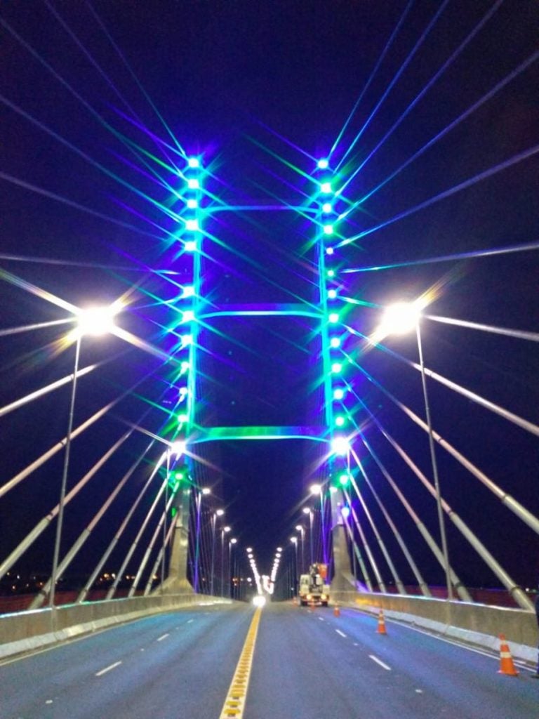 À noite, a Ponte da Esperança fica ainda mais bonita e é usada como palco para grandes campanhas e homenagens. Desde a noite desta quinta-feira (02/07), as luzes projetadas em seus estais, em verde e azul, são utilizadas como forma de agradecimento da Prefeitura de Hortolândia a todos os profissionais da saúde que atuam na linha de frente no combate ao Coronavírus, na cidade.