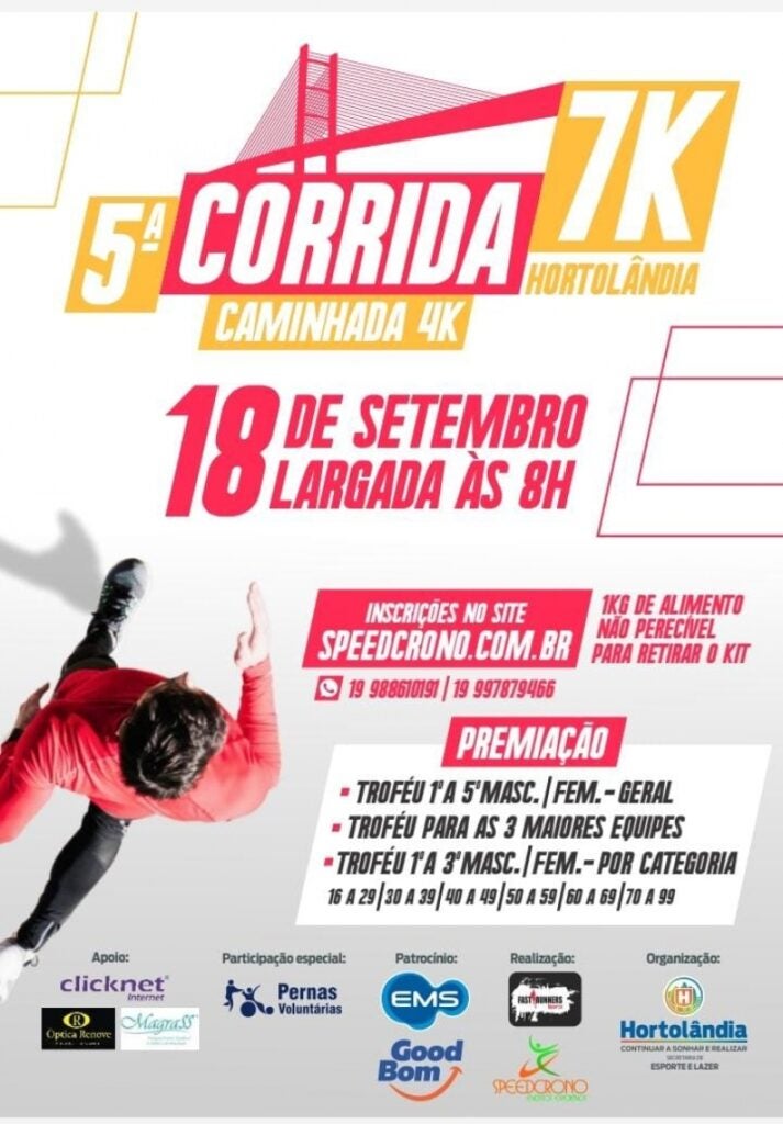 A Prefeitura de Hortolândia, por meio da Secretaria de Esporte, organiza a quinta edição da Corrida 7k e Caminhada 4k que acontece no dia 18 de setembro. As inscrições podem ser realizadas, gratuitamente, na quarta-feira (31/08), a partir das 10h, pelo site speedcrono.com.br. Quem optar pela corrida, vai encarar um percurso de sete quilômetros. Na caminhada, serão quatro quilômetros de atividade.