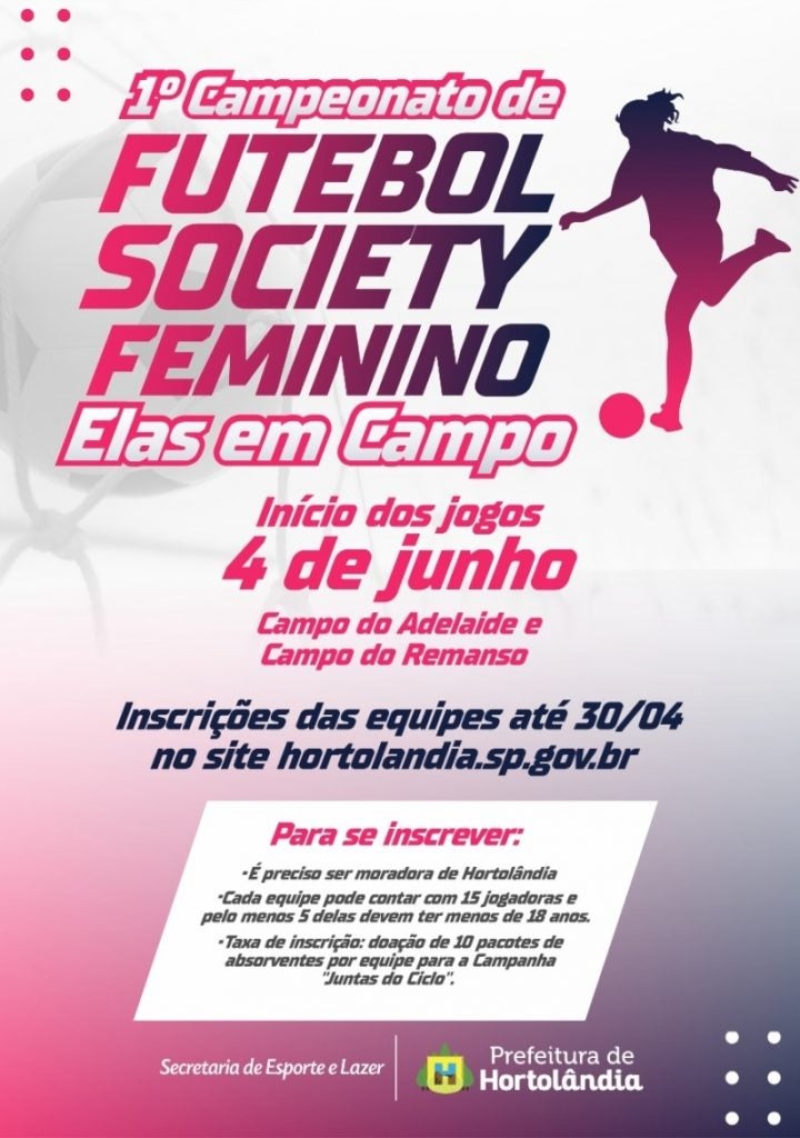 Estão abertas as inscrições das equipes para o torneio de futebol society “Elas em Campo”, primeira competição de futebol disputado em grama artificial de Hortolândia, exclusiva para as meninas. O campeonato, organizado pela Prefeitura, por meio da Secretaria de Esportes, será iniciado no dia 4 de junho. Os times interessados devem se inscrever de maneira online, pelo site www.hortolandia.sp.gov.br até o dia 30/04. Para a realização, cada equipe deve fazer a doação de 10 pacotes de absorventes para a campanha “Juntas pelo Ciclo”. A ação, promovida pelo Fundo Social, tem o objetivo de garantir para as mulheres em situação de vulnerabilidade social o acesso a absorventes.