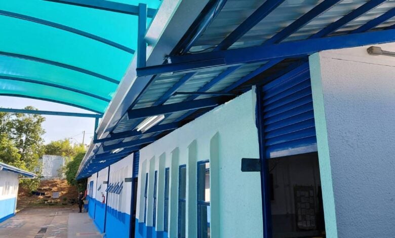 As melhorias realizadas incluem a troca do telhado do pátio e do auditório, substituição de forros em diversas salas de aula, manutenção nos banheiros e reparos no muro da escola. Além disso, a pintura externa de toda a escola e interna de quatro salas de aula e do auditório também foram executadas. Atualmente, os trabalhos finais concentram-se na substituição de algumas telhas para adequação às especificações do projeto, com acompanhamento técnico da Secretaria de Obras.