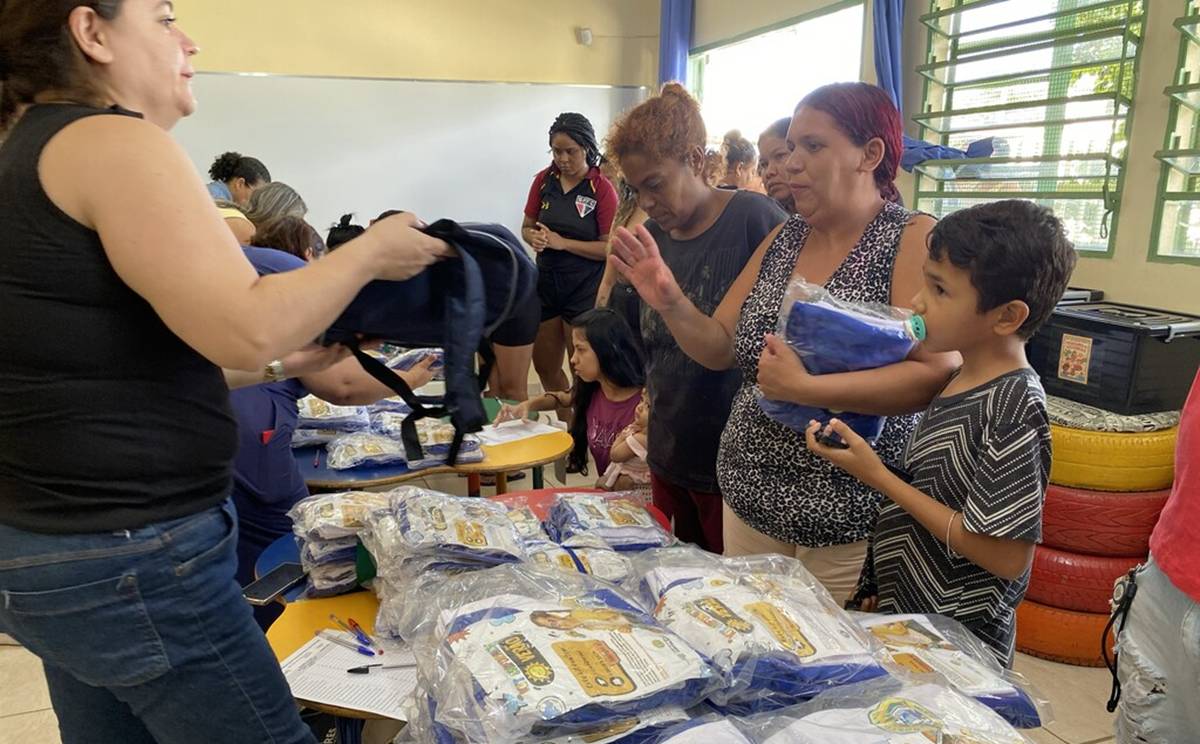 Cada estudante recebe o kit de verão com uma bermuda ou short-saia e duas camisetas, conforme medidas previamente cadastradas. O kit de inverno (casaco e calça comprida) será entregue entre abril e maio. Os kits de materiais escolares incluem mochila nova, cadernos, lápis, borracha, apontador, tesoura, cola, lápis de cor, tinta guache e estojo, organizados por faixa etária e modalidade de ensino.