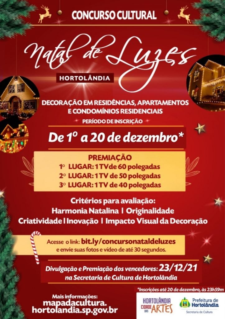 O clima natalino anima Hortolândia. Muitos moradores já enfeitam suas casas para participar do concurso “Natal de Luzes”, promovido pela Prefeitura. O concurso premiará os três imóveis da cidade com a decoração mais bonita. Com esta iniciativa, a Prefeitura busca estimular a população a decorar com enfeites e iluminação a área externa de suas residências, e assim embelezar a cidade neste período de fim de ano. Quem quiser participar deve acessar o site Mapa da Cultura (CLIQUE AQUI), da Secretaria de Cultura, e se inscrever por meio deste LINK. O prazo de inscrições termina na próxima segunda-feira (20/12). Podem participar moradores de casas, edifícios e condomínios residenciais.