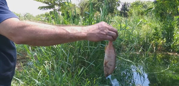 Devido o vazamento a água da nascente que era clara ficou completamente escura e matou dezenas de peixes.