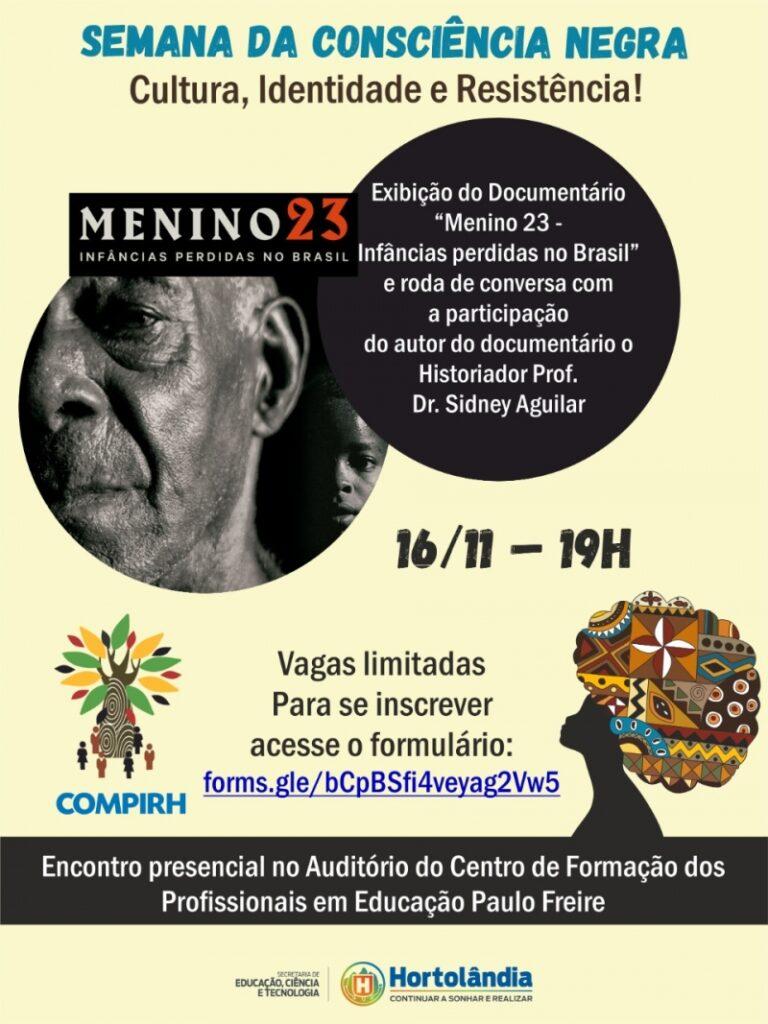 Para assistir ao documentário “Menino 23: infâncias perdidas no Brasil” e participar de roda de conversa com o autor, o historiador e Prof. Dr. Sidney Aguilar (Unicamp-Universidade Estadual de Campinas), no Centro de Formação “Paulo Freire”, é preciso se inscrever previamente. Segundo a Secretaria de Educação, Ciência e Tecnologia, há 50 vagas para profissionais da educação e 40 vagas para público em geral. Basta clicar neste link.