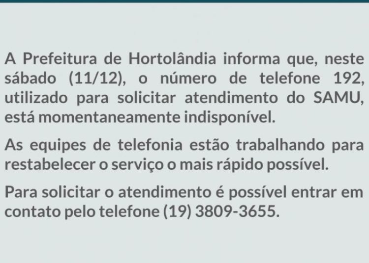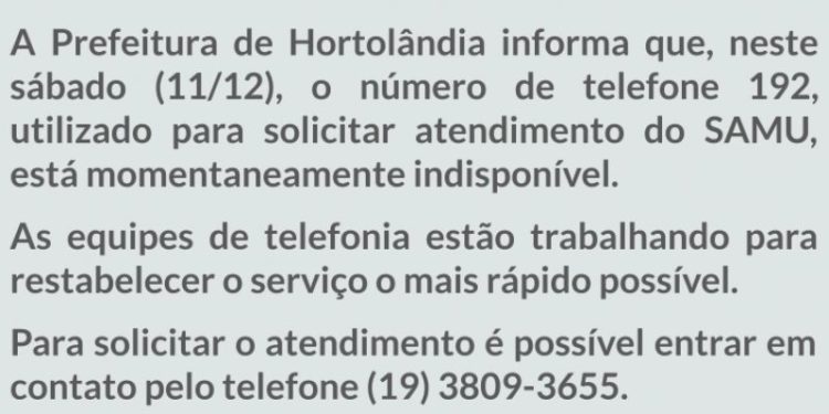 A Prefeitura de Hortolândia informa que, neste sábado (11/12), o número de telefone 192, utilizado para solicitar atendimento do SAMU, está momentaneamente indisponível.