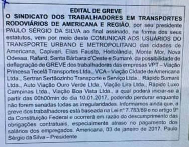 Um edital de greve publicado na sexta (07) no Jornal TodoDia anuncia a paralisação nesta terça-feira (10) a partir das 00:00 horas, segue imagem do edital: