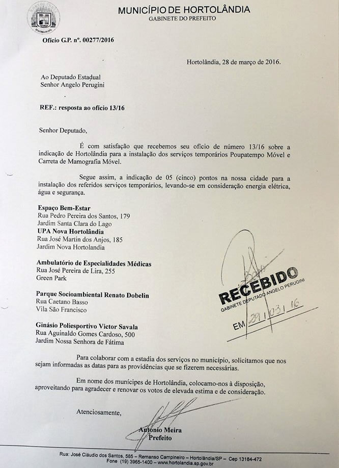 O Documento foi protocolado no dia 23 de março de 2016, conforme imagem em anexo, indicando cinco possíveis áreas para recebimento da carreta da saúde para exames de mamografia. Atualmente, a Prefeitura de Hortolândia e Governo do Estado estão acertando as partes técnicas para o pleno funcionamento da carreta.