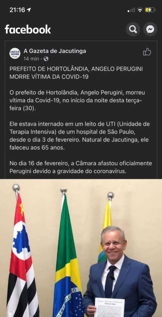 Estão circulando duas notas da cidade de Jacutinga, uma da Gazeta de Jacutinga cidade natal de Angelo e outra da Câmara, anunciando de forma equivocada o falecimento do Perugini.