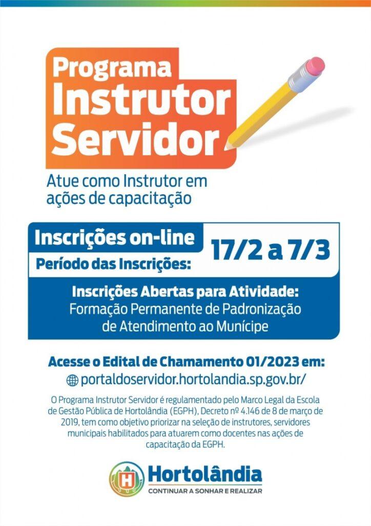 Estão abertas, a partir desta sexta-feira (17/02), as inscrições para o programa Instrutor Servidor, promovido pela Prefeitura de Hortolândia. Segundo a Secretaria de Administração e Gestão de Pessoal, a ação visa selecionar servidores municipais aptos a integrar o corpo docente da EGPH (Escola de Gestão Pública de Hortolândia) e a ministrar o curso “Formação Permanente de Padronização de Atendimento ao Munícipe”.