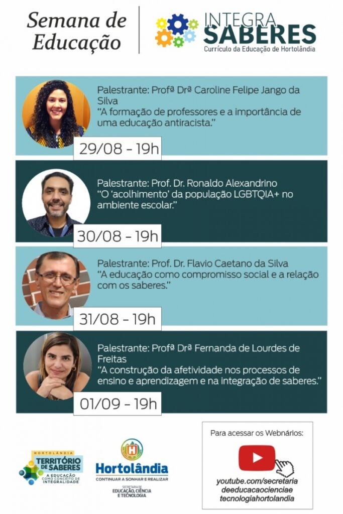 A “Semana de Educação – Integra Saberes”, evento promovido pela Prefeitura de Hortolândia, recomeça nesta segunda-feira (29/08), com mais quatro palestras ao vivo, gratuitas e abertas à comunidade em, geral. Todas elas serão transmitidas pelo canal da Secretaria de Educação, Ciência e Tecnologia no YouTube e disponibilizadas pela consulta, posteriormente.