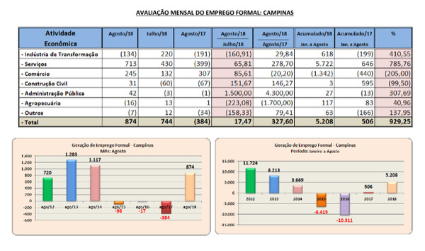 Em Campinas tivemos em agosto de 2018, 874 contratações, cerca de 327,60% acima das (-384) eliminações de agosto e 2017. No acumulado do ano (janeiro a agosto) de 2018 foram contratados em Campinas 5.208 trabalhadores, cerca de 929,25% acima das 506 contratações de 2017.