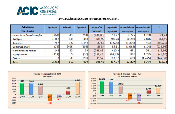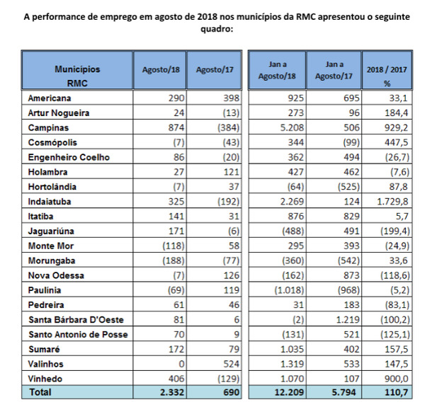 Na RMC, em agosto foram gerados 2.332 postos, resultado da admissão de 31.427 trabalhadores, contra a eliminação de 29.095 postos de trabalhadores, cerca de 237,97% acima dos 690 postos de agosto de 2017.