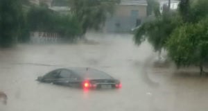 Carro fica parcialmente coberto em enchente na região do Rosolem