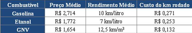 Atualmente, o preço médio do m³ do GNV no Estado de São Paulo está em R$ 1,654/m³ e o rendimento médio é de 12,5km com 1m³ de gás, enquanto o rendimento médio utilizando gasolina e etanol é de 10 e 7 km/litro, respectivamente. Comparando o custo atual dos três combustíveis, o GNV apresenta o melhor custo-benefício, com o valor de R$ 0,132 por quilômetro rodado, contra R$ 0,253 do etanol e R$ 0,271 da gasolina.