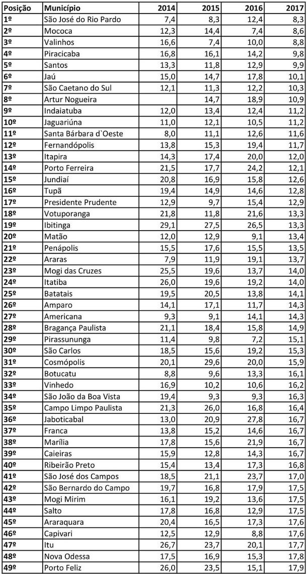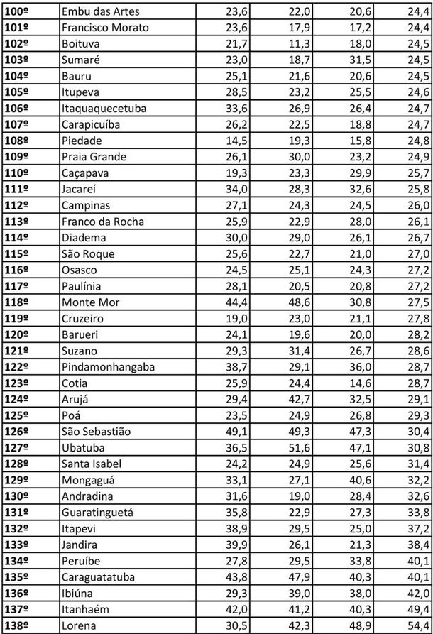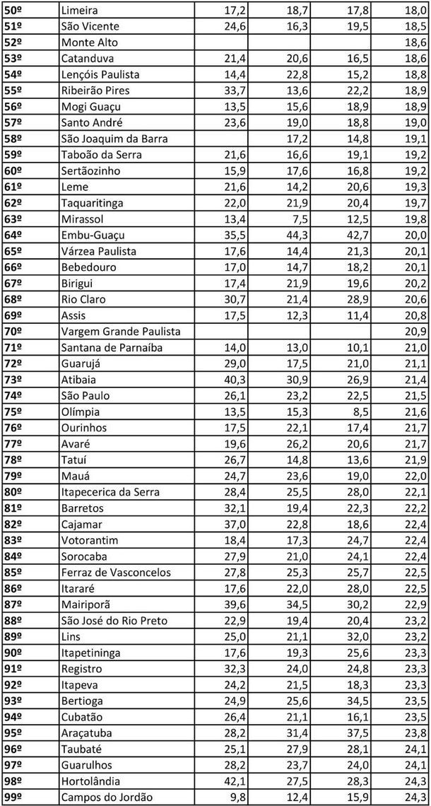 O índice considera crimes letais, sexuais e contra o patrimônio, e o ranking permite a comparação da vulnerabilidade da população a esses crimes – tanto entre municípios quanto ao longo dos anos. Confira a posição das cidades dos menores índices para os maiores (os menores índices significam mais segurança):