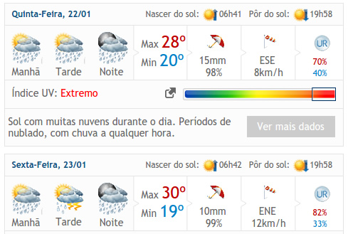 Já na quinta-feira (22), o tempo fica instável e chuvoso. As pancadas de chuva ocorrem a partir do período da manhã e se prolongam ao longo do dia. Por conta da chuva e da grande cobertura de nuvens, as temperaturas não subirão muito. Os termômetros marcarão entre os 21°C e os 29°C.